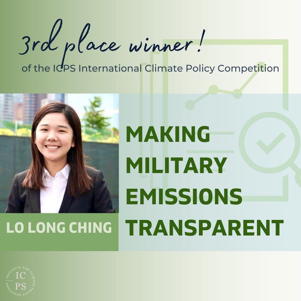 Our 3rd place winner of the first-ever ICPS International Climate Policy Competition: Lo Long Ching, also known as Chammie, is a climate advocate from Hong Kong, who developed an innovative proposal to tackle the vast and growing emissions from the military sector.